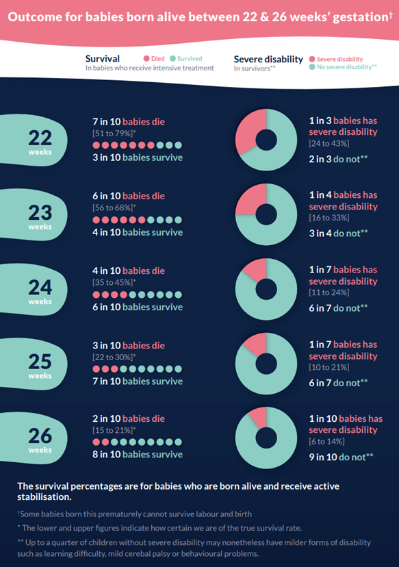 • There may not be time to counsel families before the baby is born. The BAPM framework for practice (Perinatal Management of Extreme Preterm Birth Before 27 weeks of Gestation, 2019) may be helpful alongside the outcome of births infographic (appendix 1)
